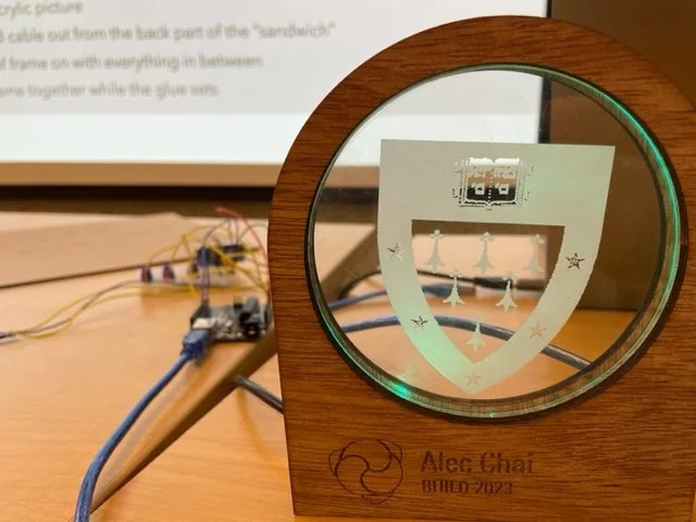 To make the frames stand out, I engraved each student's Residential College shield on the acrylic. Clear acrylic turns white when engraved, so I preprocessed the images by flipping them to negative, converting them to grayscale, and then using 1-bit dithering algorithms to maintain contrast. This allowed for a clean and striking representation of the shields when lit from the edges.